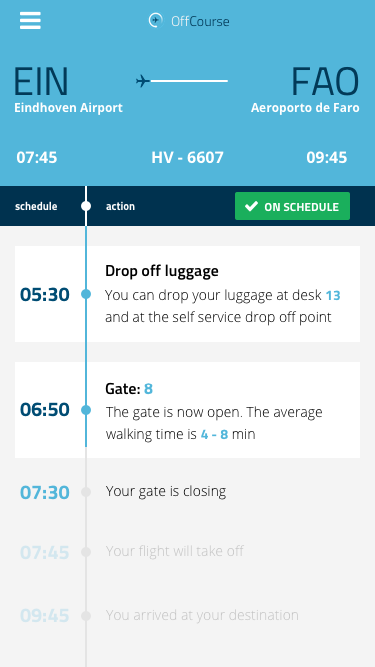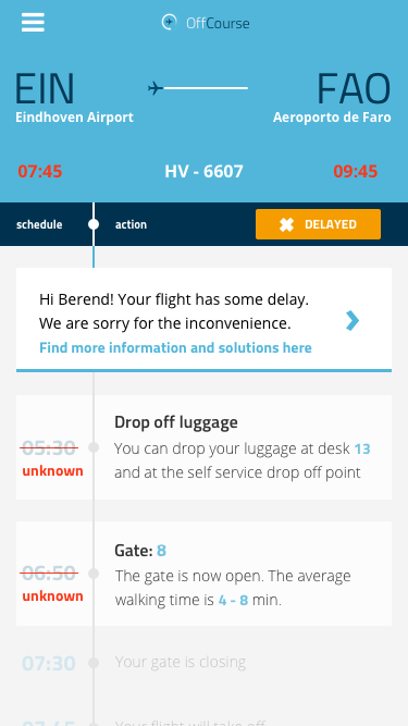 The lead booker gets a text message from the airliner which redirect them to our web applicaton: Offcourse. They will find more information about their flight, alternative solutions, and their rights as a traveler. The lead booker is also kept informed by notifications.